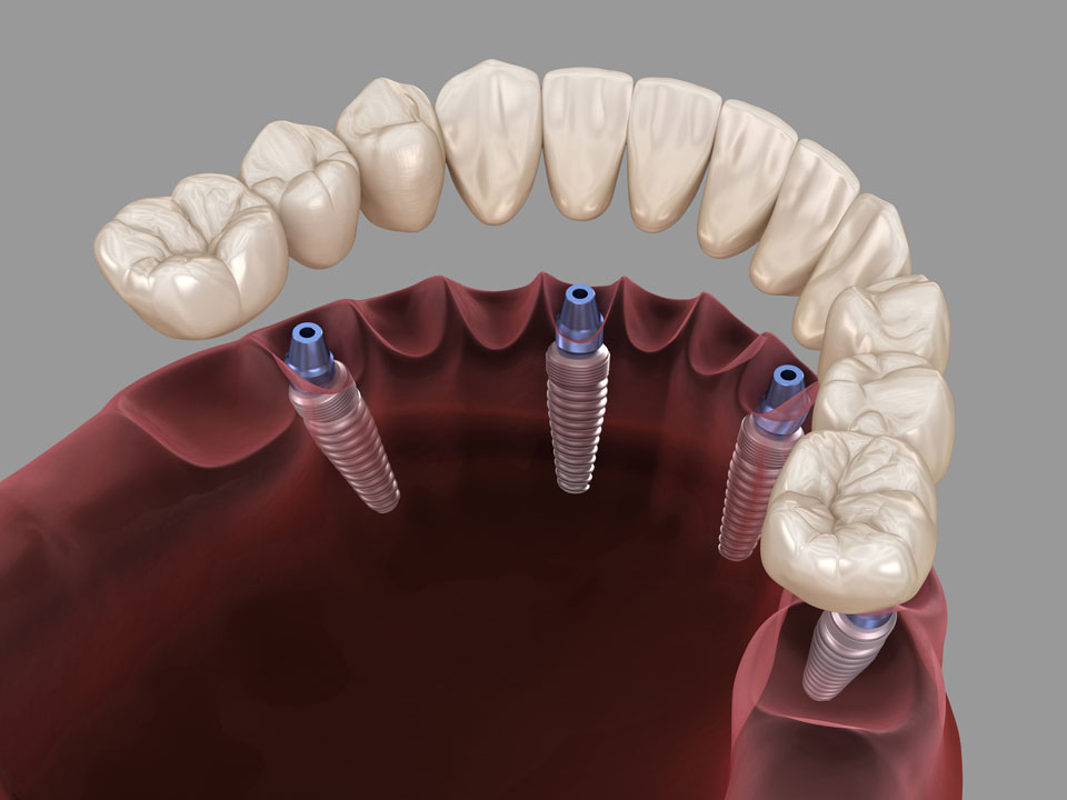 Wenn mehrere Zähne fehlen oder sogar alle, können wir mit 4 Implantaten den gesamten Kiefer mit ästhetisch anspruchsvollem Zahnersatz versorgen