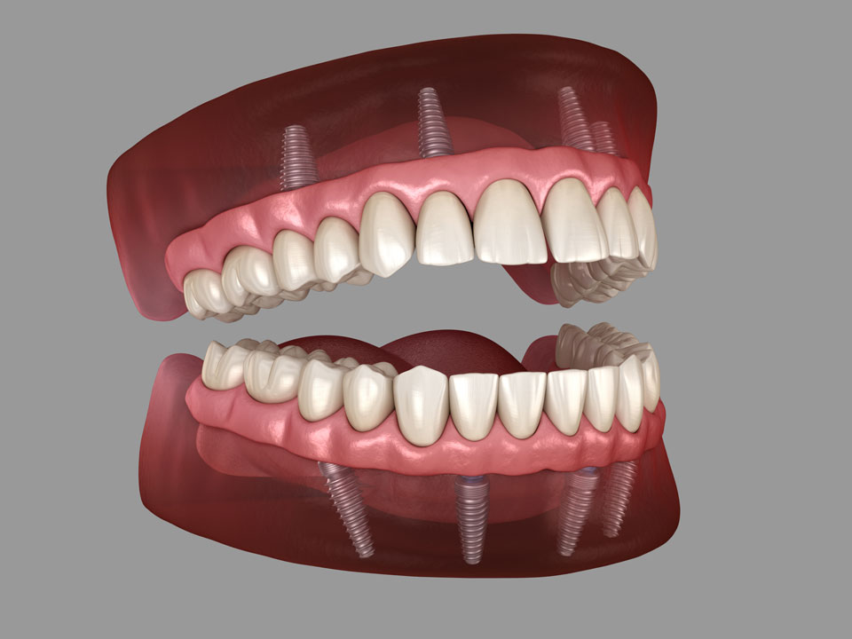 Wenn mehrere Zähne fehlen oder sogar alle, können wir mit 4 Implantaten den gesamten Kiefer mit ästhetisch anspruchsvollem Zahnersatz versorgen